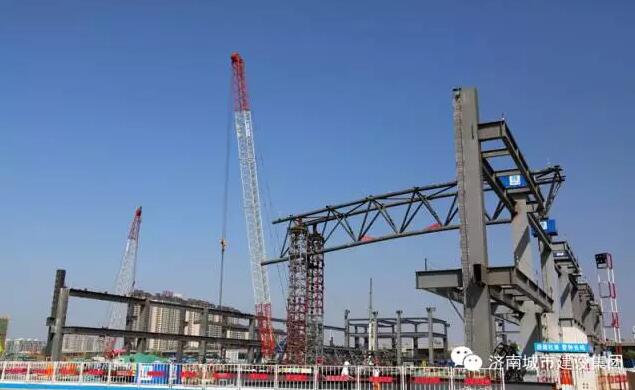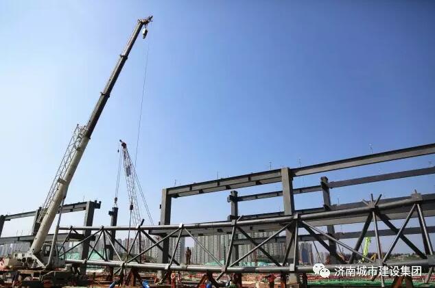 9月8日上午,濟南西部會展中心項目的第一榀(pǐn,屋架量詞)屋面鋼結構桁架吊裝完成,五號展館的鋼結構主體雛形初現,濟南西部會展中心的建設步伐又推進了扎實一步。