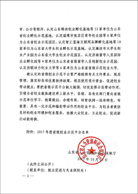 附:山東省人力資源和社會保障廳關(guān)于公布2017年度省級創(chuàng)業(yè)示范平臺名單的通知