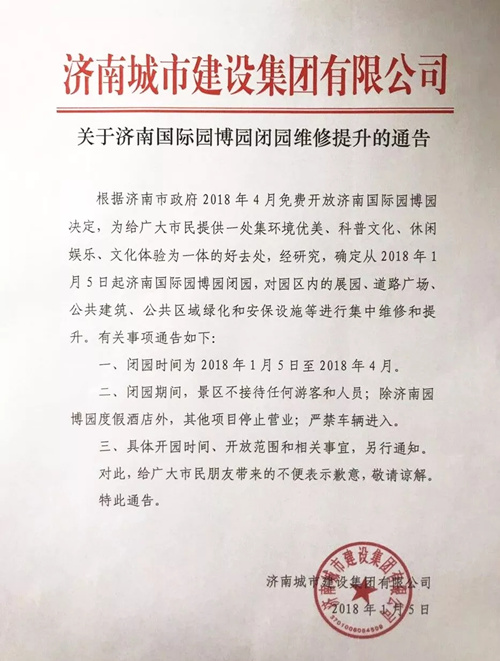 關于濟南國際園博園閉園維修提升的通告