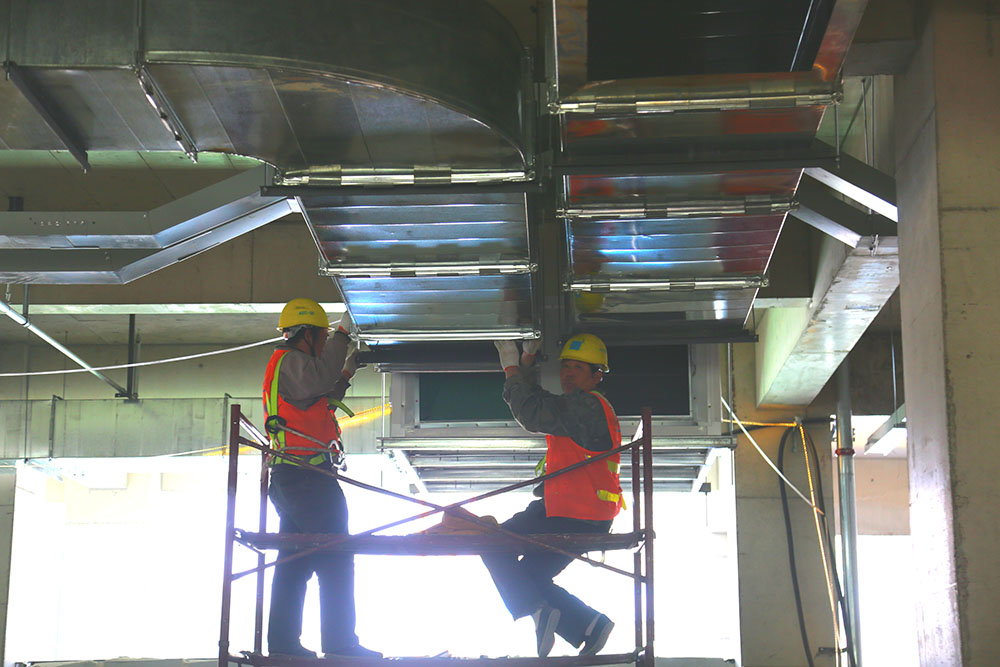 工人在室內安裝通風系統