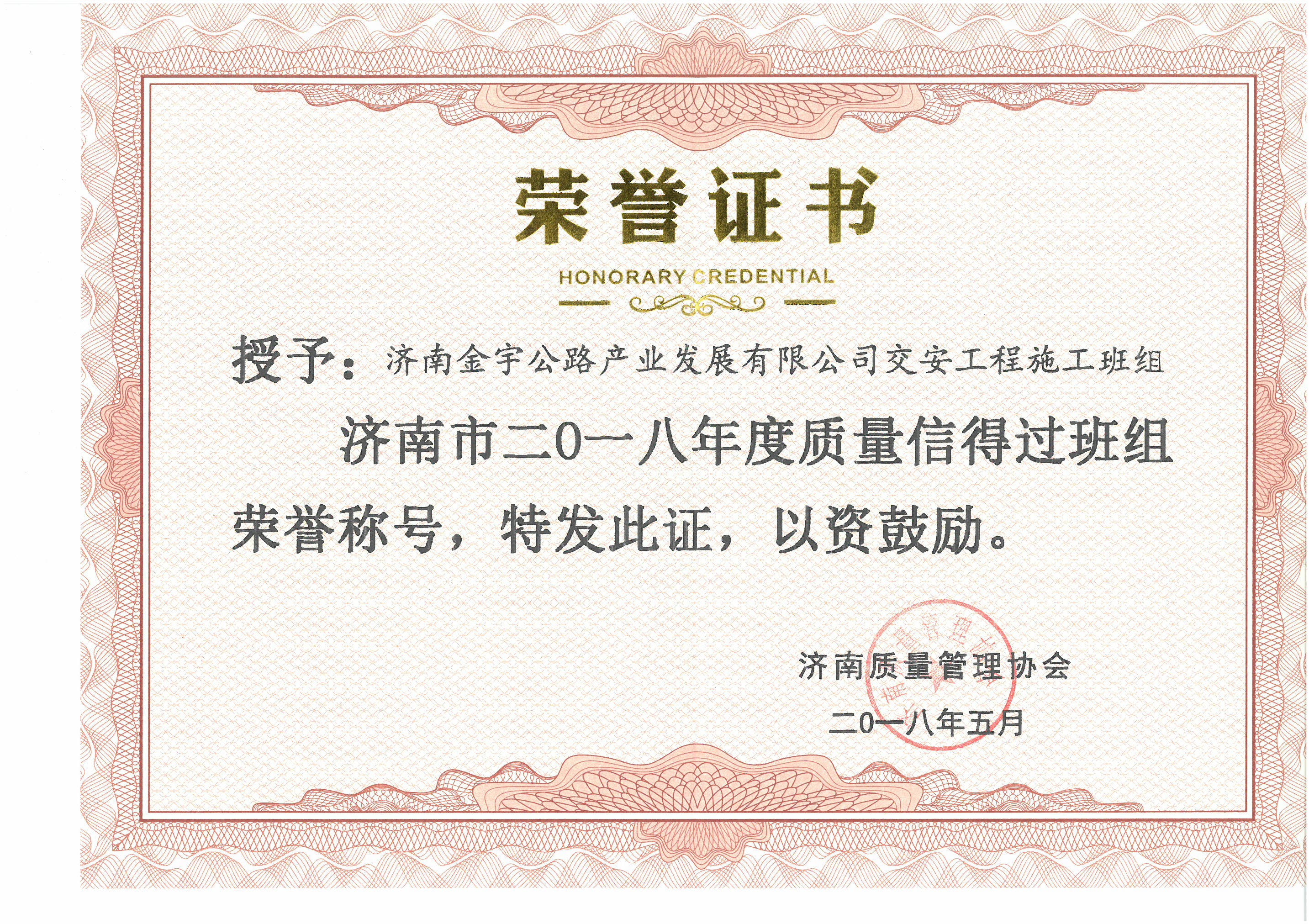 濟(jì)南金宇公路產(chǎn)業(yè)發(fā)展有限公司交安工程施工班組榮獲濟(jì)南市2018年度質(zhì)量信得過班組榮譽(yù)稱號;公司憑借《提高防眩網(wǎng)安裝一次驗(yàn)收合格率》、《提高標(biāo)志版面安裝平整度》兩項(xiàng)課題榮獲“濟(jì)南市2018年度質(zhì)量管理成果一等獎”;《提高公路聲屏障線性順直度合格率》課題榮獲“濟(jì)南市2018年度質(zhì)量管理成果二等獎”;《降低熱熔標(biāo)線逆反射系數(shù)衰減率》課題榮獲“濟(jì)南市2018年度質(zhì)量管理成果三等獎”;授予李玉寶、李景軍、劉莉三名同志2018年濟(jì)南市優(yōu)秀質(zhì)量管理工作者稱號。