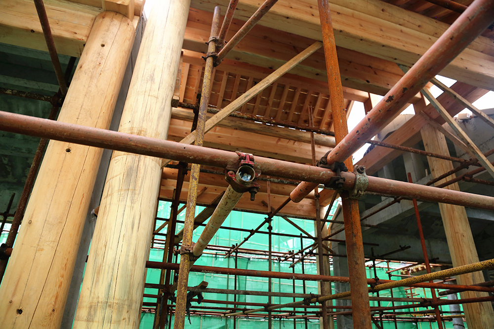 為消防安全考慮,項目建筑的屋頂及大部分構件都摒棄了木質結構,統一采用鋼筋混凝土結構。雖然采用了現代材料,但是施工復雜程度卻比原始工藝大的多。“屋頂的構件要用專門定制的模板逐層澆筑,較長的房梁還要逐段拼接,同時又要保證細節到位,做起來就比較耗時”,現場負責人介紹道。在項目入口處,有一棟小型建筑為全木制結構,據介紹,這棟建筑僅用三天就建造完成,而如果采用鋼筋混凝土結構,至少需要20天工期。