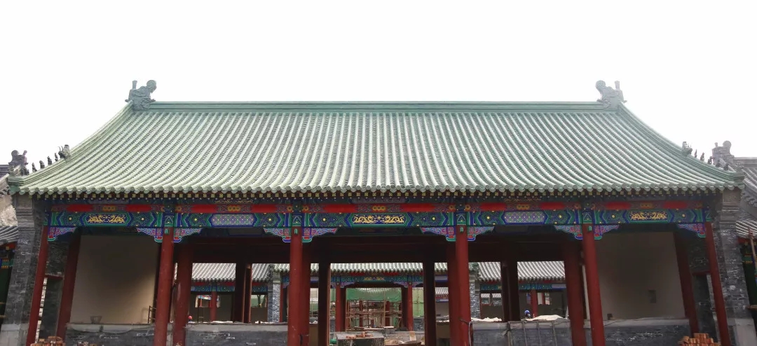 項目中仿古建筑的涂刷油漆部分做地仗都是采用“豬血+桐油”的古法油漆(“地仗”是一種采用“一麻五灰”的古老傳統工藝的施工做法)。仿古地仗油漆成活一般需要基層處理、下竹釘、捉縫灰、通灰、裹布等12道工序。清代彩繪的種類非常豐富,從紋飾的主體框架構圖和題材方面分類可分五大類:和璽類、旋子類、蘇式類、海墁類和吉祥草類。“親王府”區域的建筑彩繪主要采用了三種繪畫形式,王府中軸線上建筑部分采用旋子墨線小點金彩繪,體現為輪廓線均用墨線,花心點金的形式;配房部分采用雅伍墨旋子彩繪,指完全不用金,線條用墨,旋子用藍、綠、白、黑四色,花瓣不起暈;長廊與園林部分的小型建筑部分采用蘇式彩繪,蘇式彩繪畫面內容豐富,自然山水、花鳥魚蟲、各式人物一應俱全。彩繪待地仗完成后還需依次為:丈量起譜子、刷生油、磨平、過水布、分中、打普子、瀝大小粉等13道工序。