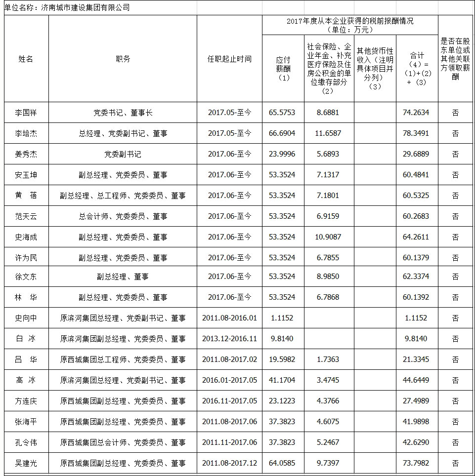 市屬國有企業2017年度企業負責人薪酬情況一覽表