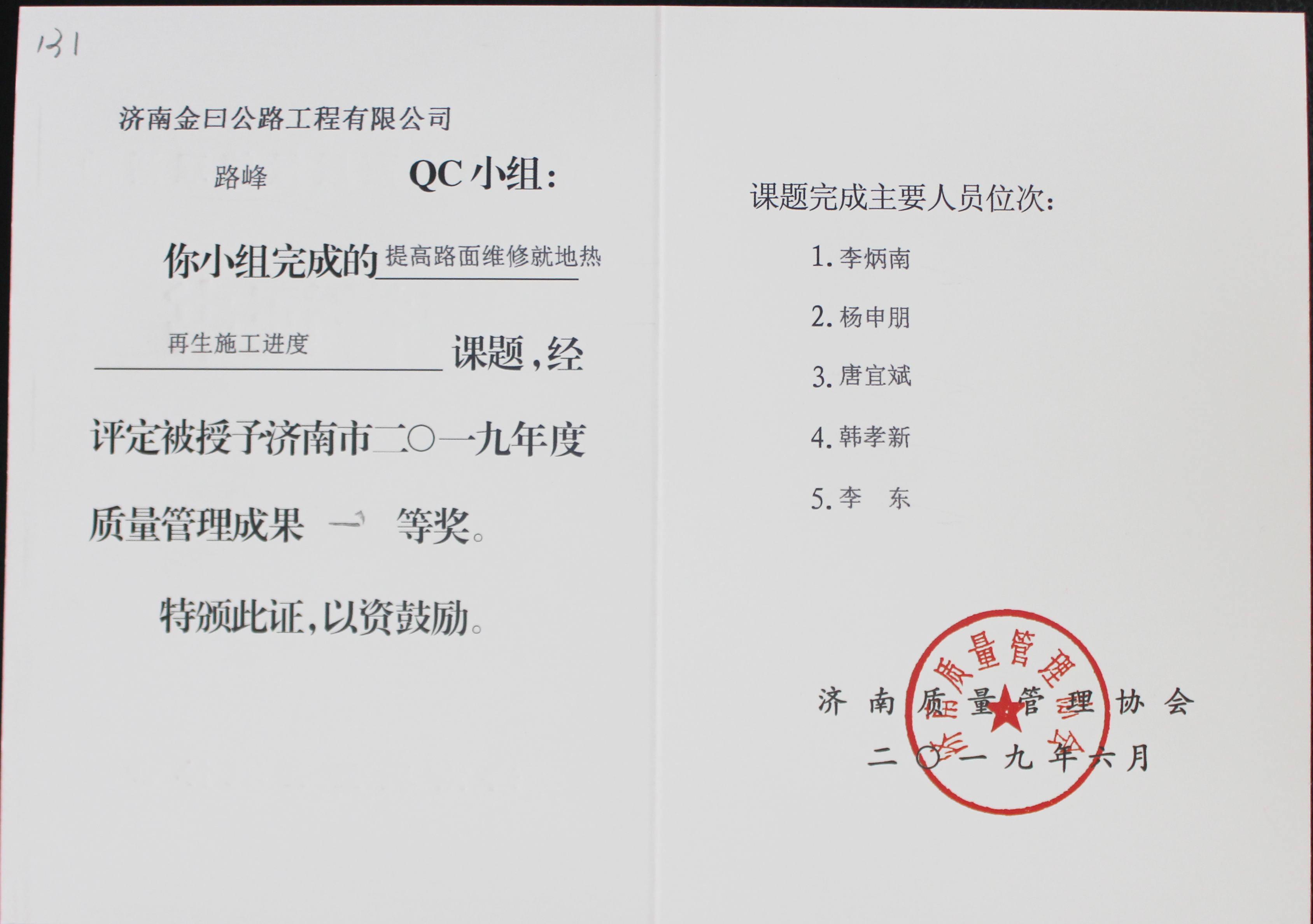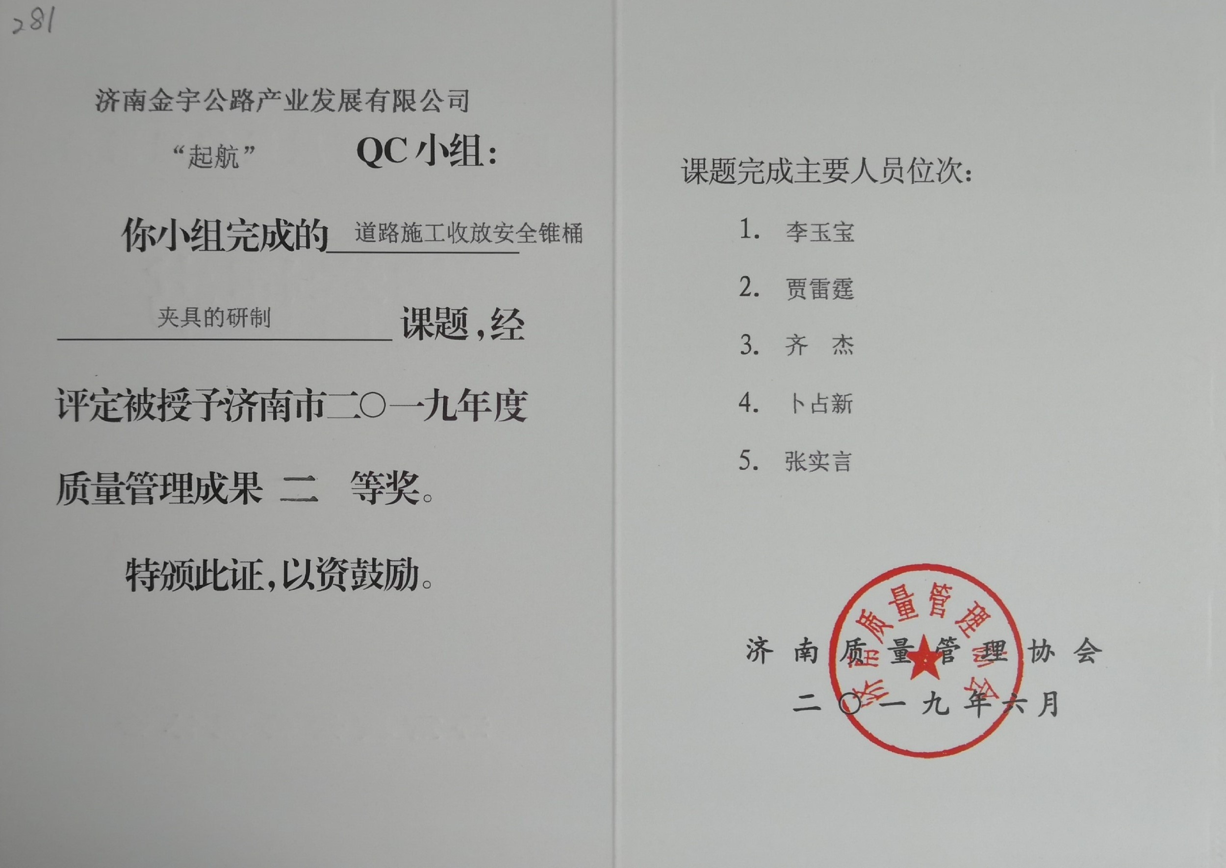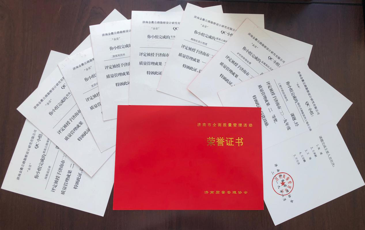 本次質(zhì)量管理活動(dòng)成果發(fā)布會(huì),金曰公司共選送質(zhì)量管理活動(dòng)成果14篇,現(xiàn)場(chǎng)發(fā)布2篇。經(jīng)濟(jì)南質(zhì)量管理協(xié)會(huì)專(zhuān)家組評(píng)審,榮獲濟(jì)南市2019年度群眾性質(zhì)量管理活動(dòng)經(jīng)驗(yàn)交流會(huì)優(yōu)秀組織獎(jiǎng)獲,報(bào)送成果獲得3個(gè)一等獎(jiǎng)、6個(gè)二等獎(jiǎng)、4個(gè)三等獎(jiǎng)、1個(gè)優(yōu)秀獎(jiǎng),道路施工班組獲得質(zhì)量信得過(guò)班組榮譽(yù)稱(chēng)號(hào)。