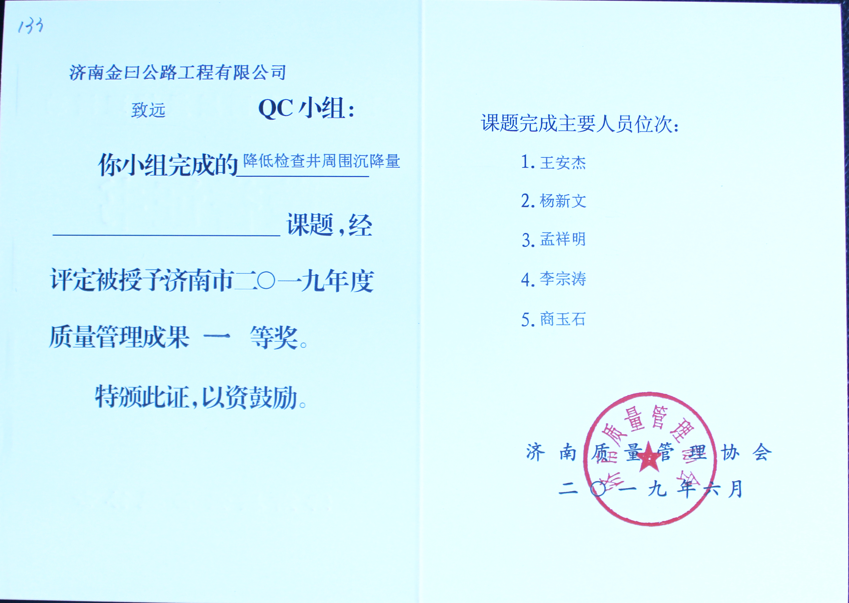 本次交流會(huì)發(fā)布QC成果124項(xiàng),金諾公司申報(bào)的四項(xiàng)QC成果獲得獎(jiǎng)勵(lì),其中《提高國(guó)省道工程附屬邊溝成品提交速度》、《提高預(yù)制箱梁質(zhì)量檢驗(yàn)評(píng)分》兩項(xiàng)課題榮獲“濟(jì)南市2019年質(zhì)量管理成果一等獎(jiǎng)”;《提高瀝青混凝土路面行駛舒適性》一項(xiàng)課題榮獲“濟(jì)南市2019年質(zhì)量管理成果二等獎(jiǎng)”;《提高擋土墻混凝土施工質(zhì)量》一項(xiàng)課題榮獲“濟(jì)南市2019年質(zhì)量管理成果三等獎(jiǎng)”。