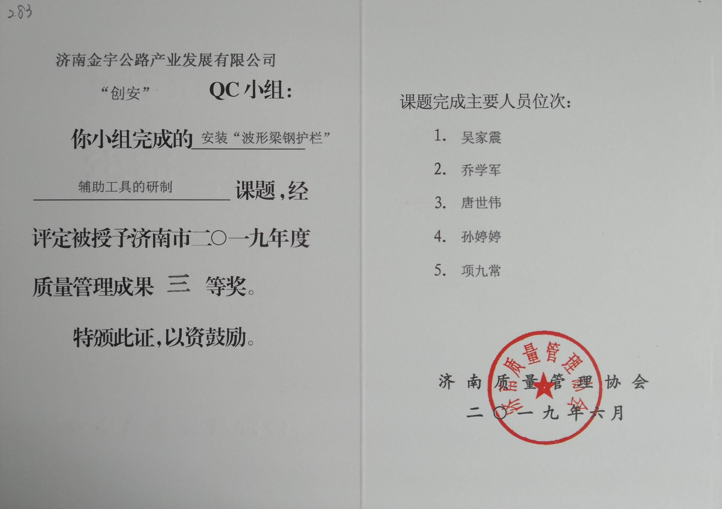 交流會(huì)上,現(xiàn)場(chǎng)專(zhuān)家根據(jù)其合理性、嚴(yán)密性及發(fā)布效果等方面對(duì)成果發(fā)布進(jìn)行綜合評(píng)審。經(jīng)過(guò)激烈角逐,金宇公司“拓新”QC小組、“前行”QC小組被授予濟(jì)南市二〇一九年度質(zhì)量管理成果一等獎(jiǎng),“起航”QC小組被授予濟(jì)南市二〇一九年度質(zhì)量管理成果二等獎(jiǎng),“創(chuàng)安”QC小組被授予濟(jì)南市二〇一九年度質(zhì)量管理成果三等獎(jiǎng);交安工程班組獲得“質(zhì)量信得過(guò)班組”榮譽(yù)稱(chēng)號(hào);李玉寶、李景軍、徐永利、賈雷霆獲得年度優(yōu)秀質(zhì)量管理工作者稱(chēng)號(hào)。