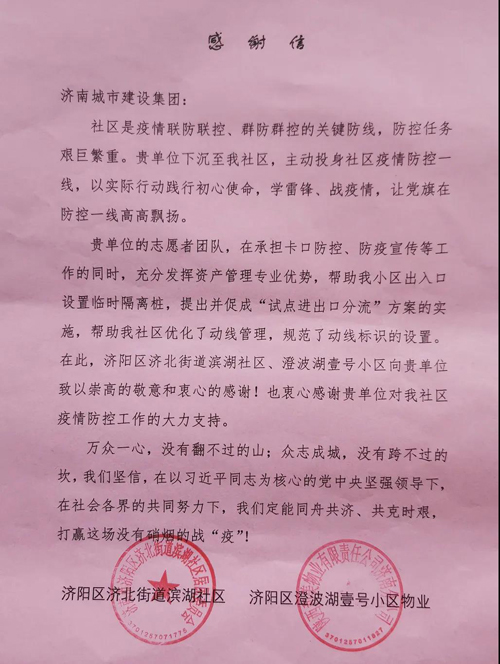 4月20日下午,在集團第十一批下沉社區疫情防控服務隊即將完成執勤任務之時,濟陽、濟北街道社區將四面錦旗和一封飽含深情的感謝信送到志愿者手中,表達對濟陽、濟北小組志愿者的感謝與認可。