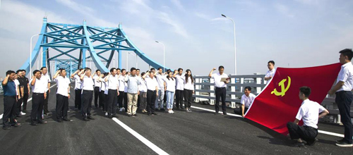 在活動中,建設集團資產管理部黨支部和市政資產運營公司黨委共40余名黨員站在濟樂高速南延線公路現場觀摩了濟樂高速南延工程的建設情況,并面對黨旗重溫入黨誓詞。黨員們聲音鏗鏘有力,表達著每一位黨員在未來的道路上將會更加堅定地擁護黨的領導,努力踐行共產黨人的初心和使命。