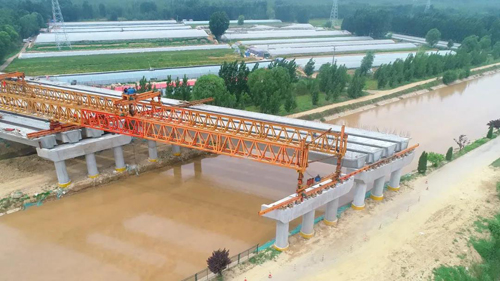 濟樂高速南延線工程TJ-1標段最后一片預制箱梁位于邢家渡引黃河干渠上空,其結構長度為40米,縱向跨度大,架設難度高。為確保最后一片預制箱梁的順利架設,項目人員凝心聚力、攻堅克難,制定應急預案、統籌調配機械設備,強化箱梁架設安全風險源防控,嚴格實施全員、全過程安全檢查,確保運梁、架梁等各項工序安全可控。