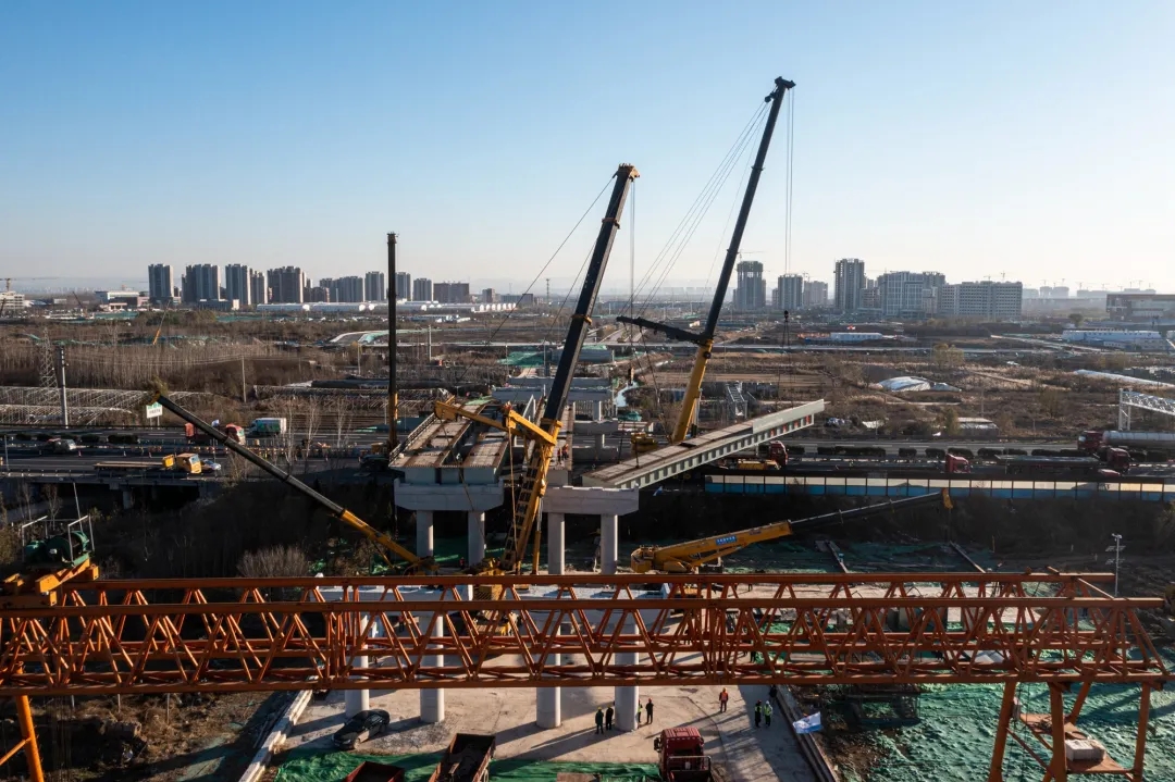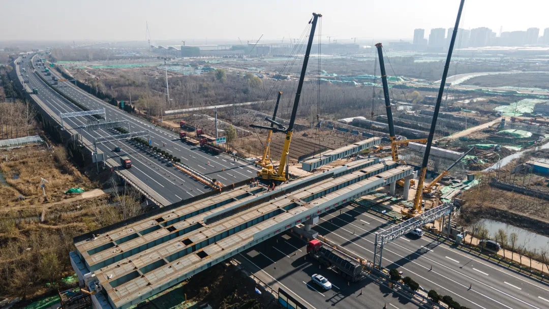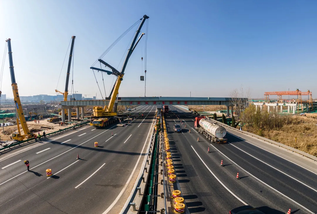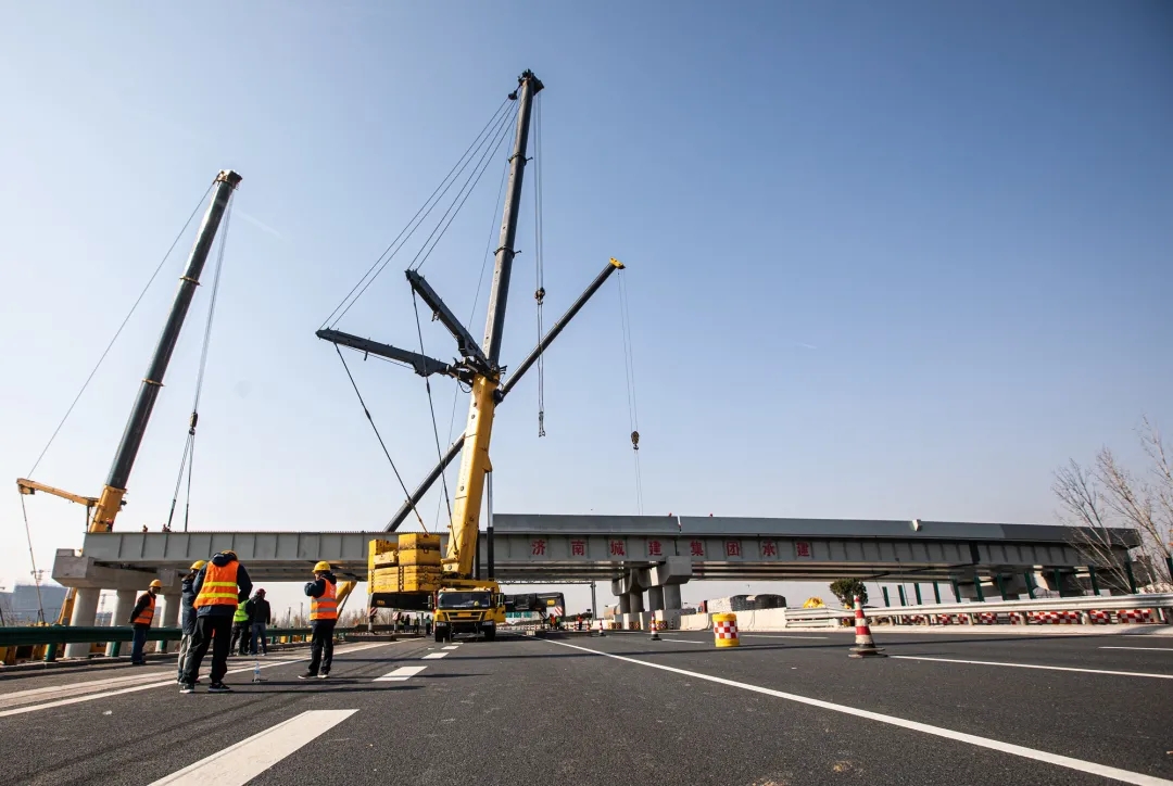 11月25日,歷時8小時施工作業,由建設集團受委托建設,集團所屬濟南城建集團有限公司第四分公司負責施工建設的濟南新舊動能轉換起步區智慧物流園區二期工程一標段西環路跨線橋鋼箱梁吊裝完成,順利跨越青銀高速。