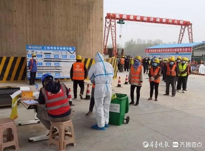 從場區外圍可以看到,濟南黃河大橋擴建項目部有著一套完備的現場疫情防控體系。出入口有工作人員值守,對進場人員進行詳細詢問、登記。