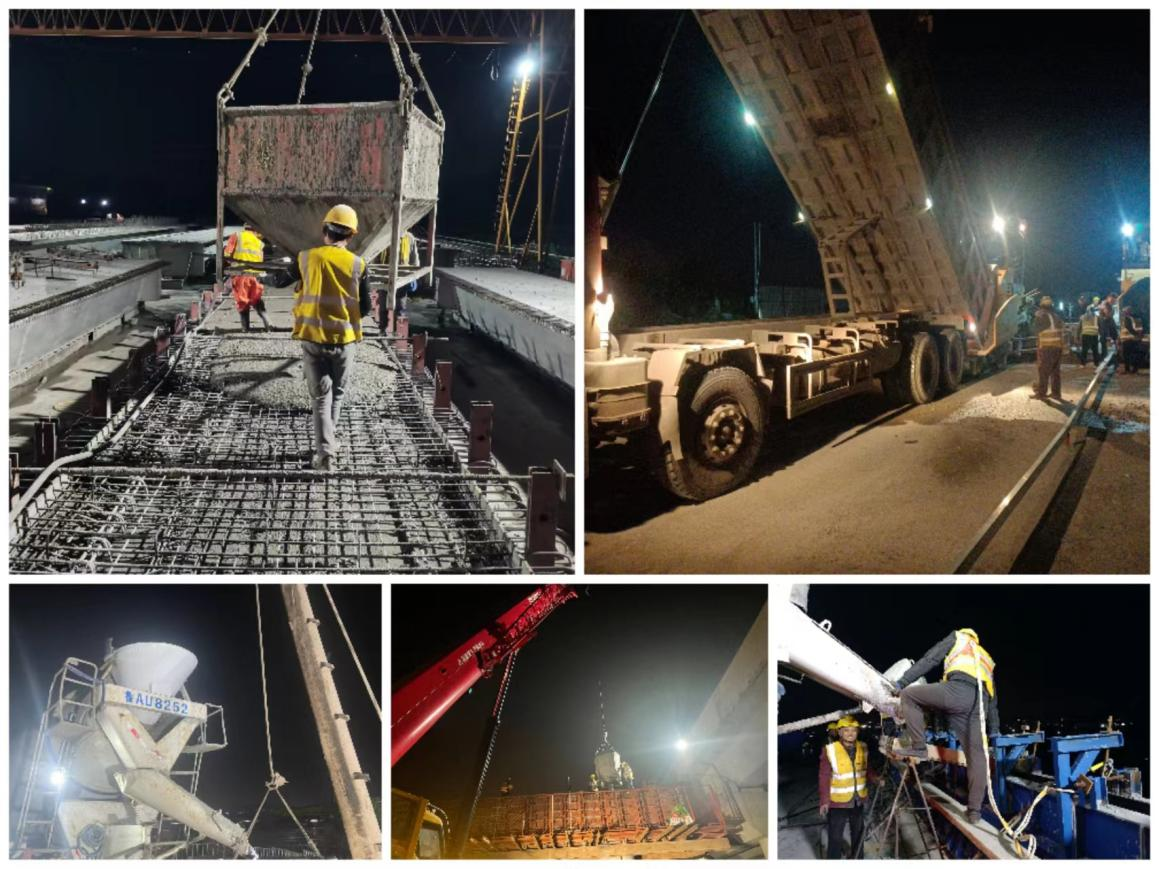 第三階段交通導(dǎo)改路段全長(zhǎng)490米,共計(jì)18跨,由105片箱梁、66棵樁基、56根墩柱組成,總面積約7000平方米。項(xiàng)目部前后場(chǎng)緊密配合,優(yōu)化施工順序,強(qiáng)化工序銜接,共計(jì)調(diào)配攤鋪機(jī)3臺(tái)、雙鋼輪壓路機(jī)4臺(tái)、運(yùn)輸車20余輛,連續(xù)施工24小時(shí)順利完成導(dǎo)改路段路面攤鋪,提前一周完成施工。左幅的貫通為橋梁右幅施工提供了作業(yè)面,仲宮大橋互通區(qū)施工進(jìn)入沖刺階段。