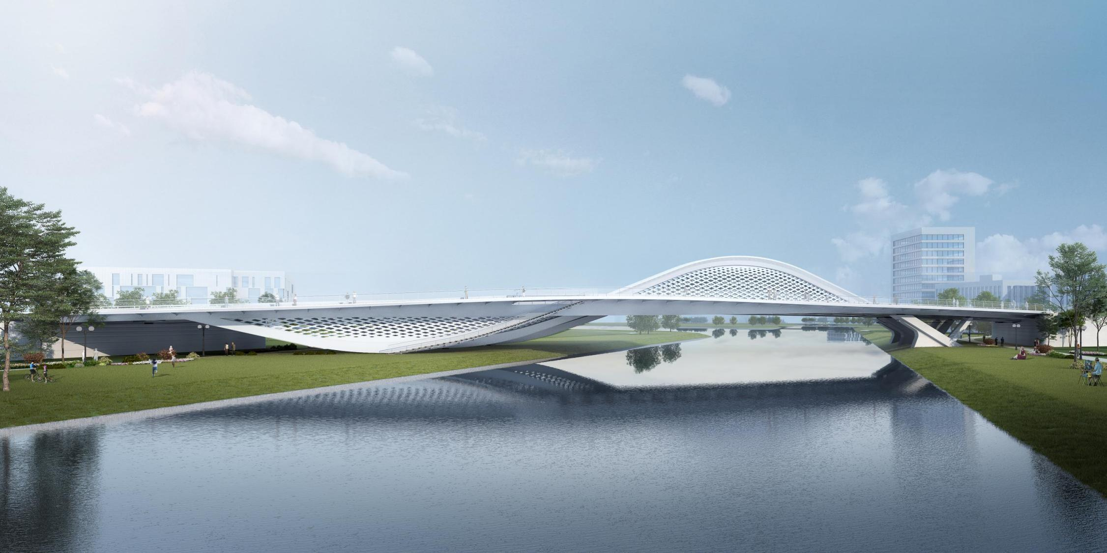 橫一路、橫二路大寺河橋作為起步區規劃的第一批景觀橋梁,由濟南城市建設集團有限公司受委托建設,兩座橋梁由世界著名橋梁設計師Marc MIMRAM先生主設計,通過研究濟南的歷史和文化,以泉與太極這個設計為根基,將泉城的剛中有柔、柔中帶剛,與太極互為印證,力與美相結合,完成兩座景觀橋梁的設計。
