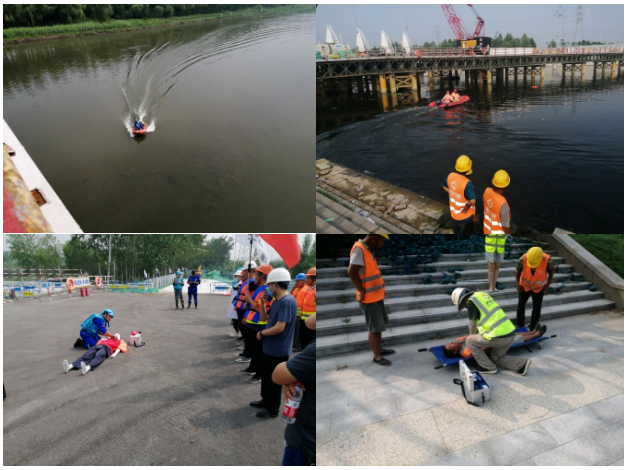 應急響應啟動后,各小組隊員全部到崗到位。第一組進行堤壩加固,確保堤壩安全,防止潰堤;第二組負責拋投救生圈,進行落水人員的救援;第三組乘坐救援沖鋒舟對落水人員進行救援,將落水人員打撈上岸;落水人員上岸后,由醫療救護組進行現場急救,并由救護組轉運至醫院進行下一步治療。