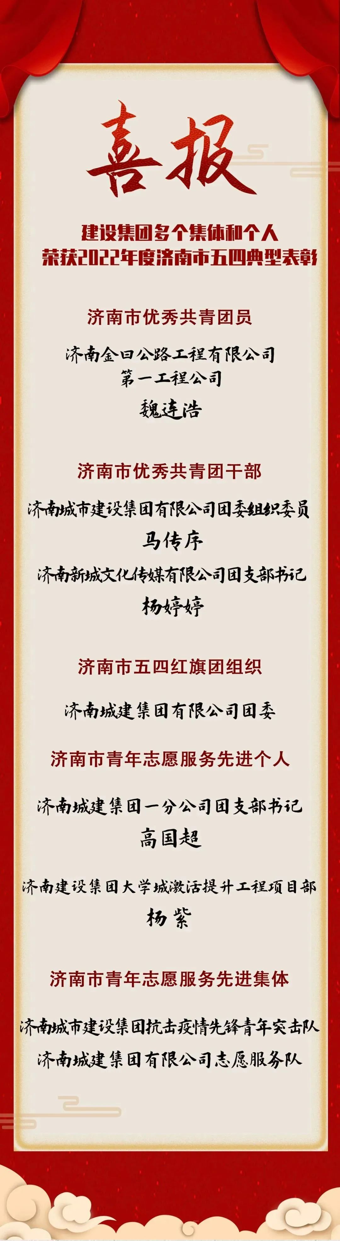 5月5日,共青團濟南市委公布了《2022年度濟南市五四典型表揚通報》,建設集團團委所屬團組織及團員青年榮獲“濟南市優秀共青團員”“濟南市優秀共青團干部”“濟南市五四紅旗團組織”“濟南市青年志愿服務先進個人”“濟南市青年志愿服務先進集體”等5項榮譽稱號。