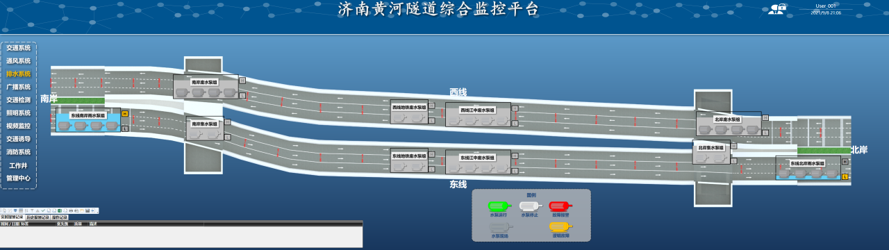 在濟南黃河濟濼路隧道中,交通系統的主要設備包括72個道路指示燈、7塊情報板和12組車感線圈,設備的應用可以有效地誘導車輛按照規定的路線和速度行駛,保證交通流暢和安全,進一步提高交通運營效率;