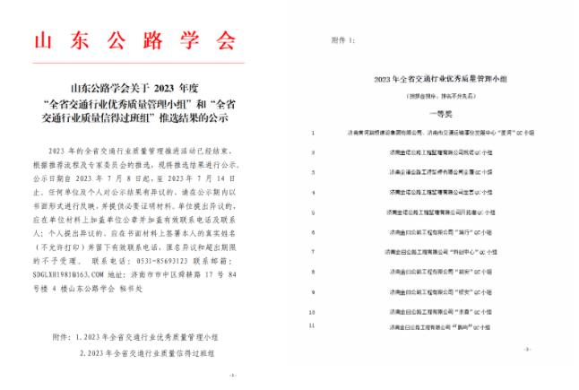 山東公路學會發布《山東公路學會關于2023年度“全省交通行業優秀質量管理小組”和“全省交通行業質量信得過班組”推選結果的公示》。金曰公司“篤行”“科創中心”“路安”“橋安”“求真”“鵲鳴”6個QC小組成果榮獲一等獎,其他成果另獲二等獎19項、三等獎5項;5個班組獲得“全省交通行業信得過班組”稱號。