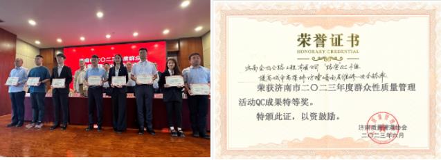 濟南質量管理協會發布《關于公布濟南市 2023 年度群眾性質量管理活動優秀成果、質量信得過班組的通知》。金曰公司“路安”QC小組的成果“提高城市高架橋防撞墻面層維修一次合格率”榮評“濟南市2023年度群眾性質量管理活動QC成果特等獎”。
