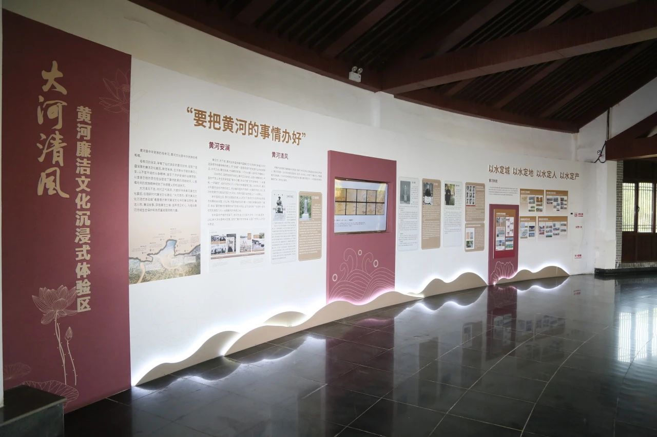 在濟西濕地突出“黃河”文化特色,打造“大河清風——黃河廉潔文化沉浸式體驗展區”,觀、聽、品、感、悟五感感受大河清風。