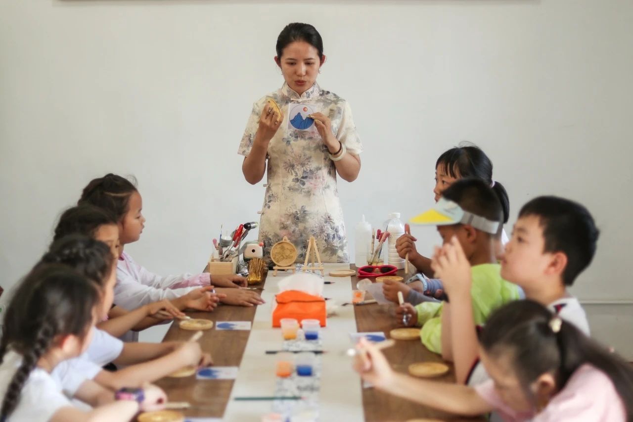 老師帶領(lǐng)小朋友現(xiàn)場(chǎng)體驗(yàn)掐絲琺瑯和水拓團(tuán)扇非遺技藝。孩子們認(rèn)真地完成掐絲、點(diǎn)藍(lán)等步驟,用顏料勾勒出美麗的圖案,不僅體驗(yàn)了手工制作的樂趣,也對(duì)非遺技藝有了更直觀的認(rèn)識(shí)。