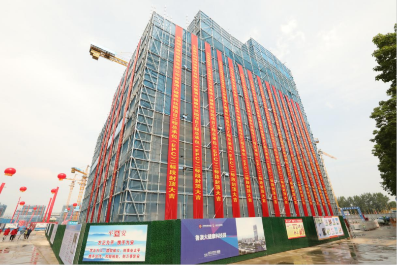 魯澳大健康科技園是山東省與澳門在中醫藥領域合作的核心平臺,由濟南市、山東中醫藥大學、澳門科技大學三方聯手打造。項目位于長清區大學路,總建筑面積19.6萬㎡,是建設集團產業園經濟產業鏈首批項目,由所屬山東貫月科創投資集團投資建設。項目共分為兩個標段,當前封頂的屬于二標段。