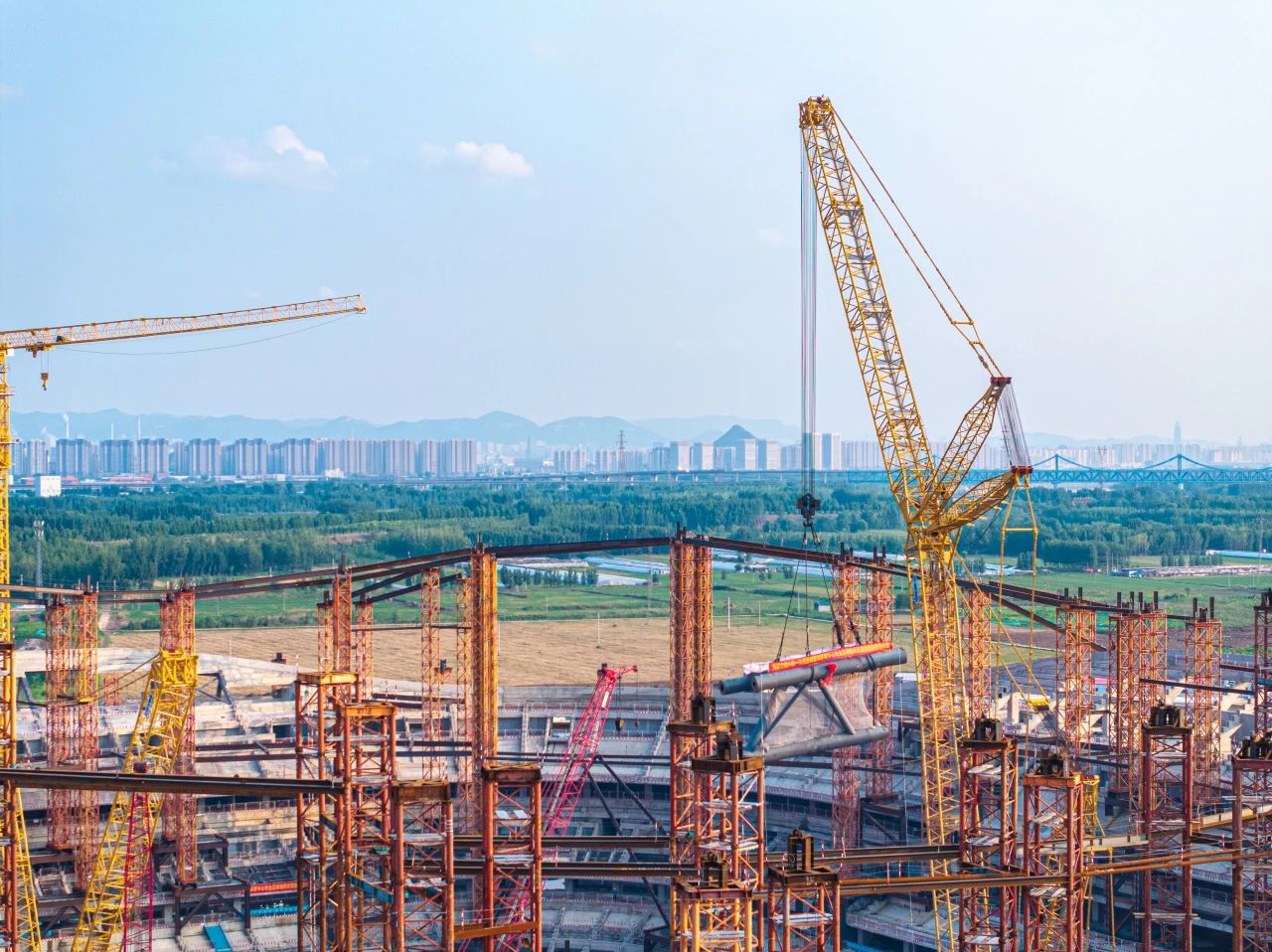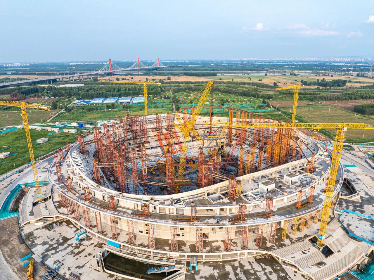 本次實施的首次吊裝段,位于內(nèi)環(huán)桁架,單元吊重達(dá)168噸,起吊縱深高達(dá)60余米。項目位于濟(jì)南新舊動能轉(zhuǎn)換起步區(qū),建筑面積19.73萬平方米,建筑高度為60米,是山東省首個6萬座專業(yè)足球場,可承辦國際、國內(nèi)重大體育賽事。同時也是國內(nèi)體育場館懸挑長度最大的工程,最大懸挑長度達(dá)到了45米,屋蓋鋼結(jié)構(gòu)由星形拱桁架、內(nèi)環(huán)桁架、外環(huán)桁架、單層網(wǎng)格及挑檐組成,總鋼量約3.1萬噸,靠36根排架柱支撐,形成巨型無柱大懸挑空間,在整體結(jié)構(gòu)中起到了承上啟下作用,下方排架柱與混凝土結(jié)構(gòu)相連,上方支撐索結(jié)構(gòu)、膜結(jié)構(gòu)。項目預(yù)計在2026年底竣工驗收完成。