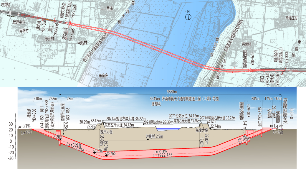 濟南市航天大道穿黃隧道工程(I期)項目東起高新區航天大道與X012交叉口,向西下穿黃河后止于西岸起步區馬店村,全長3888米,作為串聯黃河兩岸的骨干線,是山東省、濟南市重點項目,對提升省市形象、改善人居出行、搭建城北片區骨架路網起到重要的支撐帶動作用。