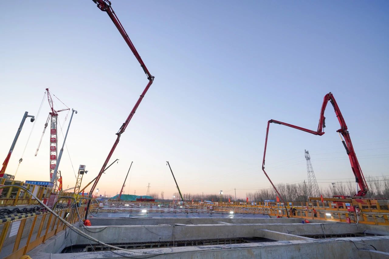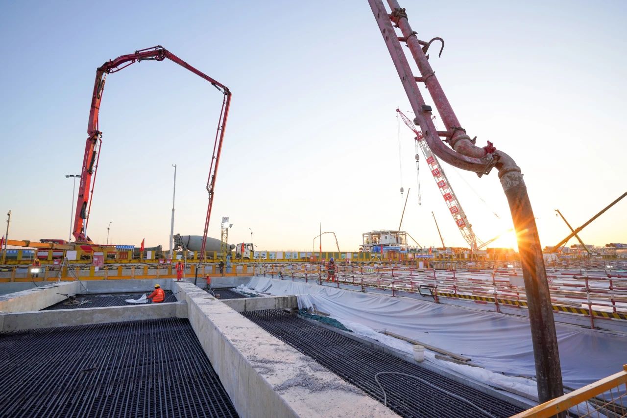 東岸主體結構分為16個獨立倉段進行施工,鋼筋總量約9500噸,混凝土總方量約4.4萬方。主體結構施工過程中面臨諸多挑戰與困難,施工過程中嚴格按照施工計劃,精心組織、科學管理,對16個獨立倉段合理劃分施工區域,依次展開作業。各施工班組緊密配合,確保鋼筋綁扎、模板安裝、混凝土澆筑等工序有序進行。2024年8月19日主體結構正式開始施工,截至12月29日主體結構完成整體封頂,比原計劃工期提前28天,為后續盾構始發奠定了堅實的基礎。