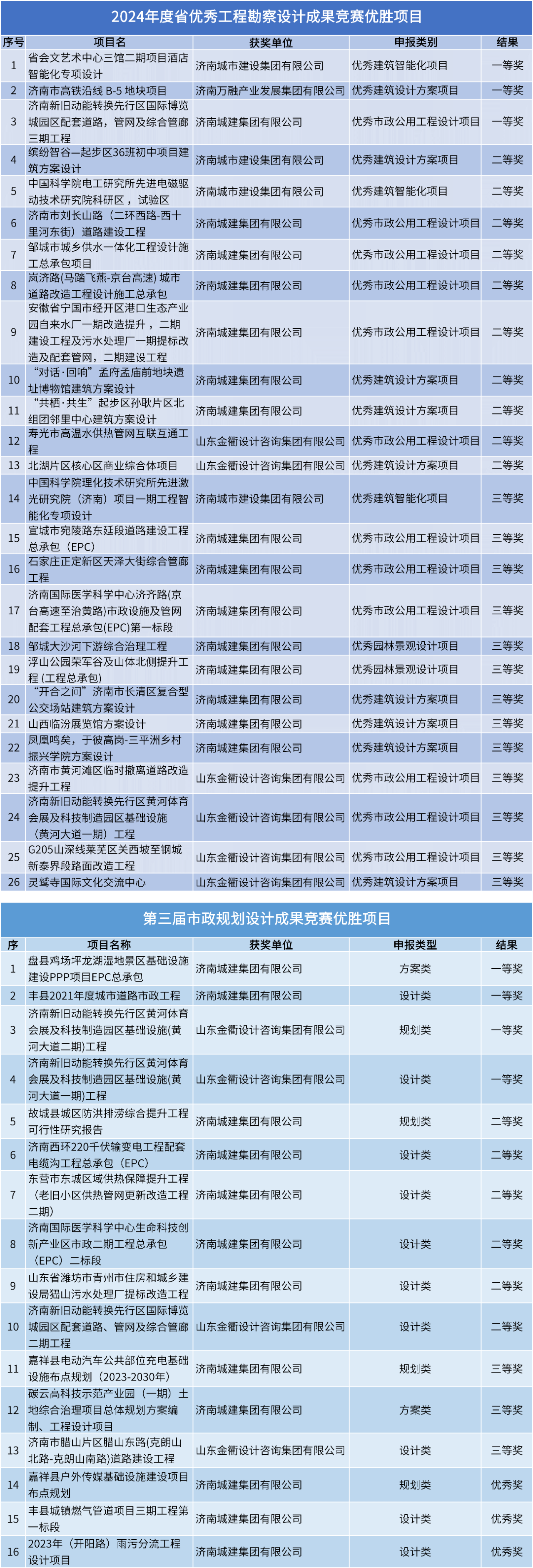 近日,建設集團及其所屬濟南萬融產業發展集團有限公司、濟南城建集團有限公司、山東金衢設計咨詢集團有限公司在2024年度優秀工程勘察設計成果競賽和第三屆市政規劃設計成果競賽兩項省級賽事中斬獲佳績。