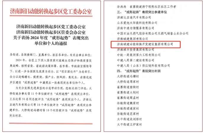 2月6日,濟南新舊動能轉換起步區召開2025年工作動員大會,通報表彰2024年度“成形起勢”表現突出的單位及個人。建設集團所屬濟南城建動能轉換開發建設集團有限公司,榮獲2024年度起步區“成形起勢”表現突出參建單位。